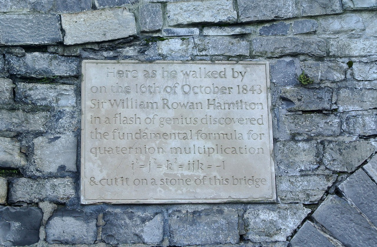能够舍弃乘法交换律而构造出相容的、实际有用的代数系统,这是一项也许可以同非欧几何思想的形成相媲美的第一流的发现。有一天(1843年10月16日),当哈密顿和他的妻子出去散步,走到一座桥上时,他(经过15年徒劳的思索之后)突然有了一种醍醐灌顶的感觉,以至于在桥面上刻下了新代数的基本公式。他的伟大发现直到今天仍然指引着代数学家们通往其他代数的道路。实际上数学家们步哈密顿的后尘,通过对域否定一个或更多的公设并发展其结果,而随意创造出各种代数。这些“代数”中有的极其有用;包含这许多代数的一般理论中也包括了哈密顿的伟大发明。