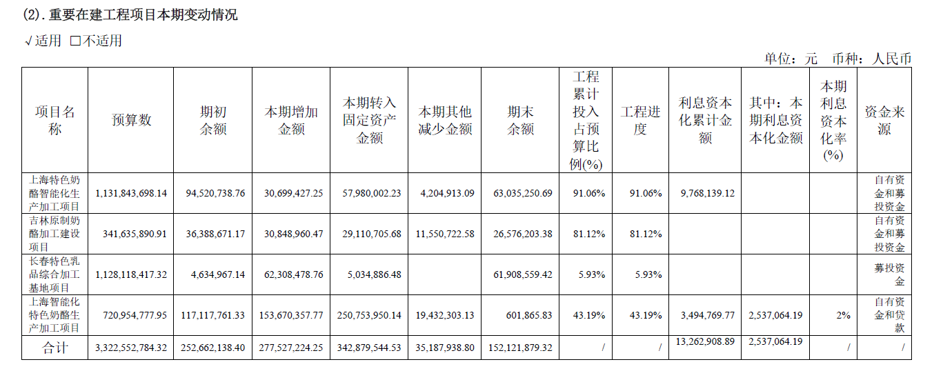 根据妙可蓝多披露的2024年年报,从2021年7月募集资金至2024年末,计划内所有建设项目均未完工,其中长春特色乳品综合加工基地项目预算投资额11亿元,占非公开发行股票募集资金38%,截至2024年末完工进度仅为5.93%,该项目计划建成3.2万吨稀奶油生产线、D90脱盐乳清粉生产线及原制奶酪块生产线。