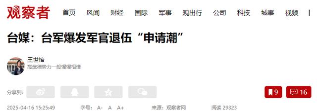 信息来源:观察者网,2025年4月16日,台媒:台军爆发军官退伍“申请潮”