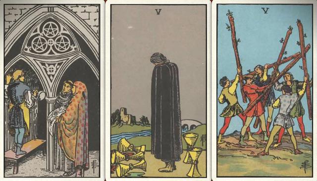 卜牌:星币三+ 圣杯五+ 权杖五+