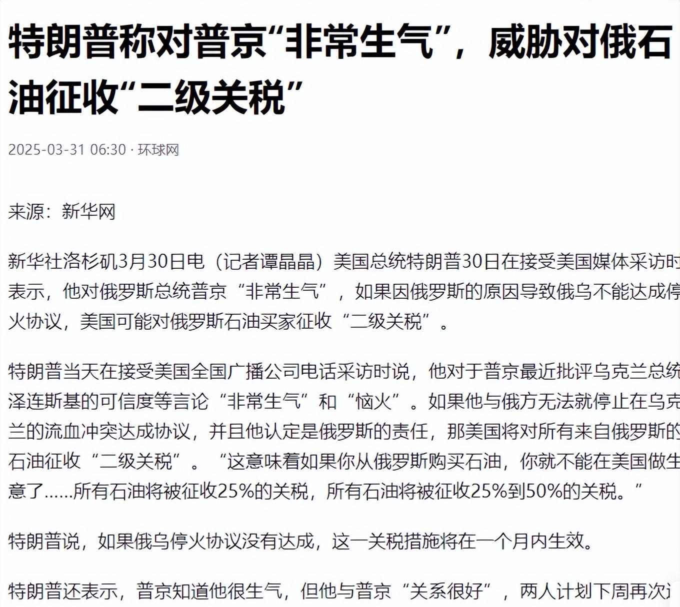 3月30日,特朗普在接受美国全国广播公司采访时强硬表态,如果俄罗斯不配合促成俄乌停火,美国将对俄罗斯石油出口征收“二级关税”。