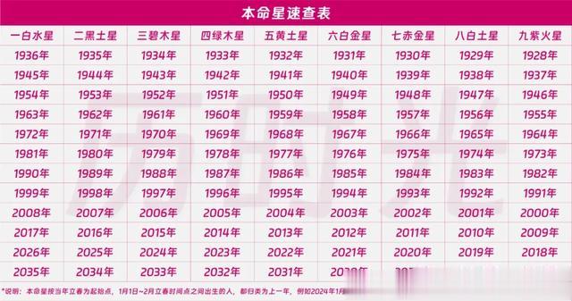 ②对照速查表,对号入座即可,但是对于公历1月1日至立春之间出生的人来说,上一年的星才是他们的本命星。
