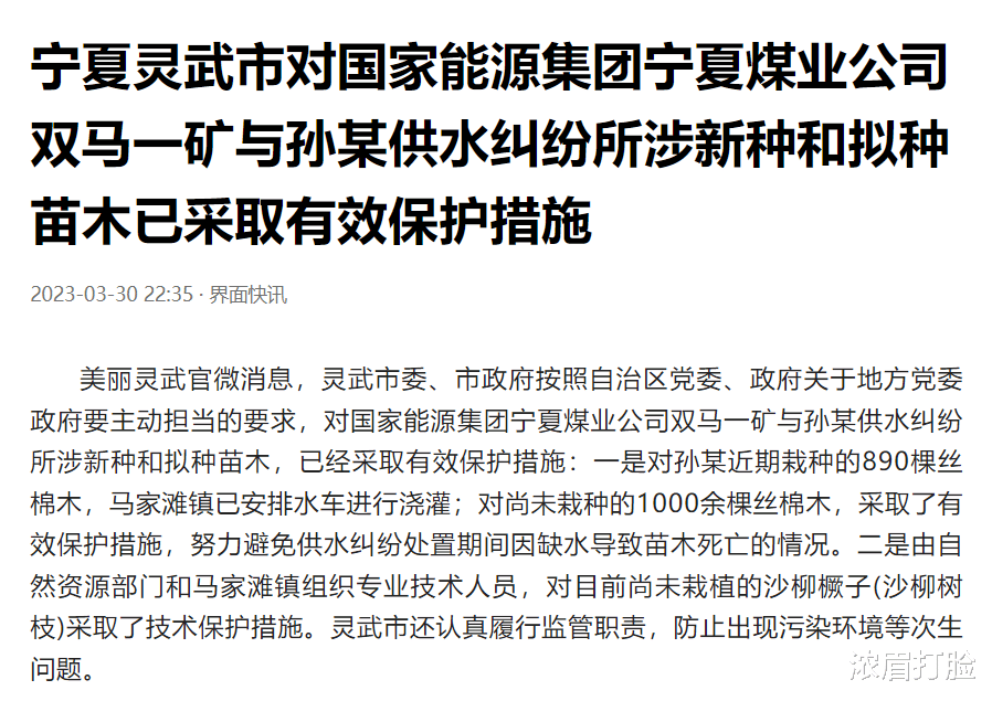 经过多日的协商,灵武市提出对孙某近期栽种的890棵丝棉木,指定镇政府安排水车浇灌。同时对尚未栽种的1000余棵丝棉木,采取保护措施。