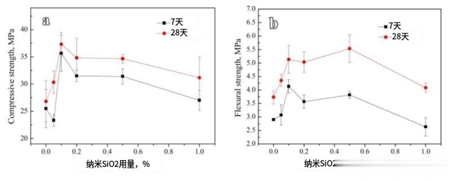 与经过7天固化后的性能相比,经过28天固化后的抗压强度和抗弯强度显示出类似的变化趋势。与7天性能一样,机械性能在纳米SiO2用量增加时并非呈线性增加。
