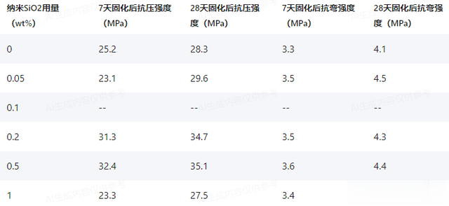 使用0.2 wt%的纳米SiO2时,7天抗压强度和抗弯强度分别为31.3 MPa和3.5 MPa,分别比对照样品增加了24%和6%。然而,与0.1 wt%用量相比,这两个数值都下降了约11%。