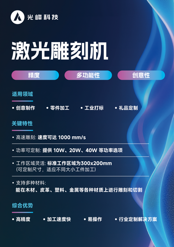 二是定制化优势。这算是此次光峰激光雕刻机最大的产品亮点,也是和很多传统品牌企业不同的地方。比如光峰可以实现功率定制、提供10W、20W、40W等功率选项,可以让用户根据不同材料和雕刻要求灵活选择。