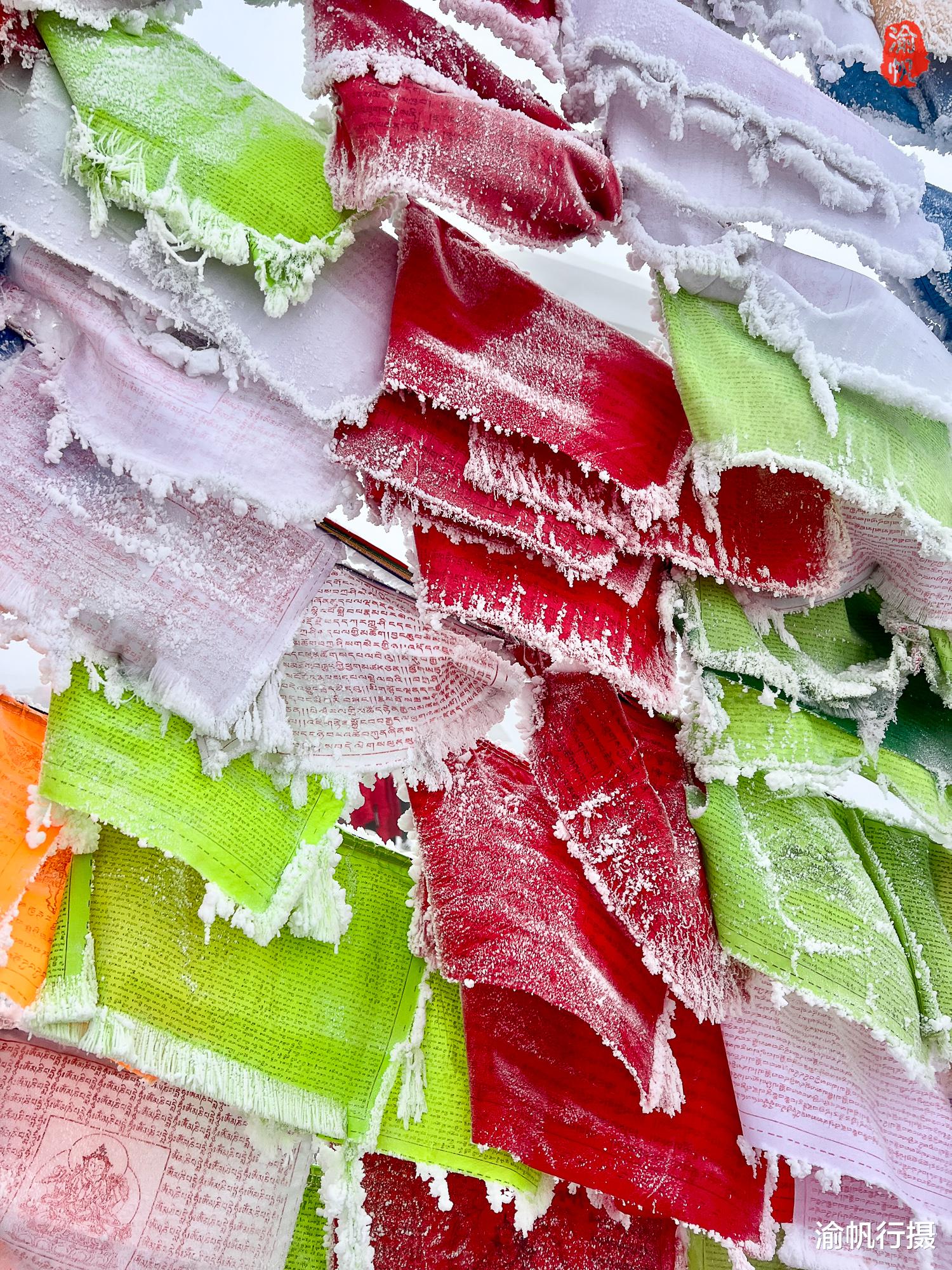 沿着318国道继续返程,行不多远便来到有着“进藏第一关”之称的折多山,它是从川藏线上首个需要翻越的高山垭口,反过来,我们从新都桥翻越折多山,也算是离开了康巴藏区。山上的观雪台是欣赏雪山景观的绝佳地点,这里的海拔高度约4298米。山顶五颜六色的经幡,随风飘荡,为雪山增色不少。需要特别提醒的是,向上爬的时候一定要慢,一是要预防高反,二是要注意别摔倒,很多道路上都结起了厚厚的冰层,很容易打滑。