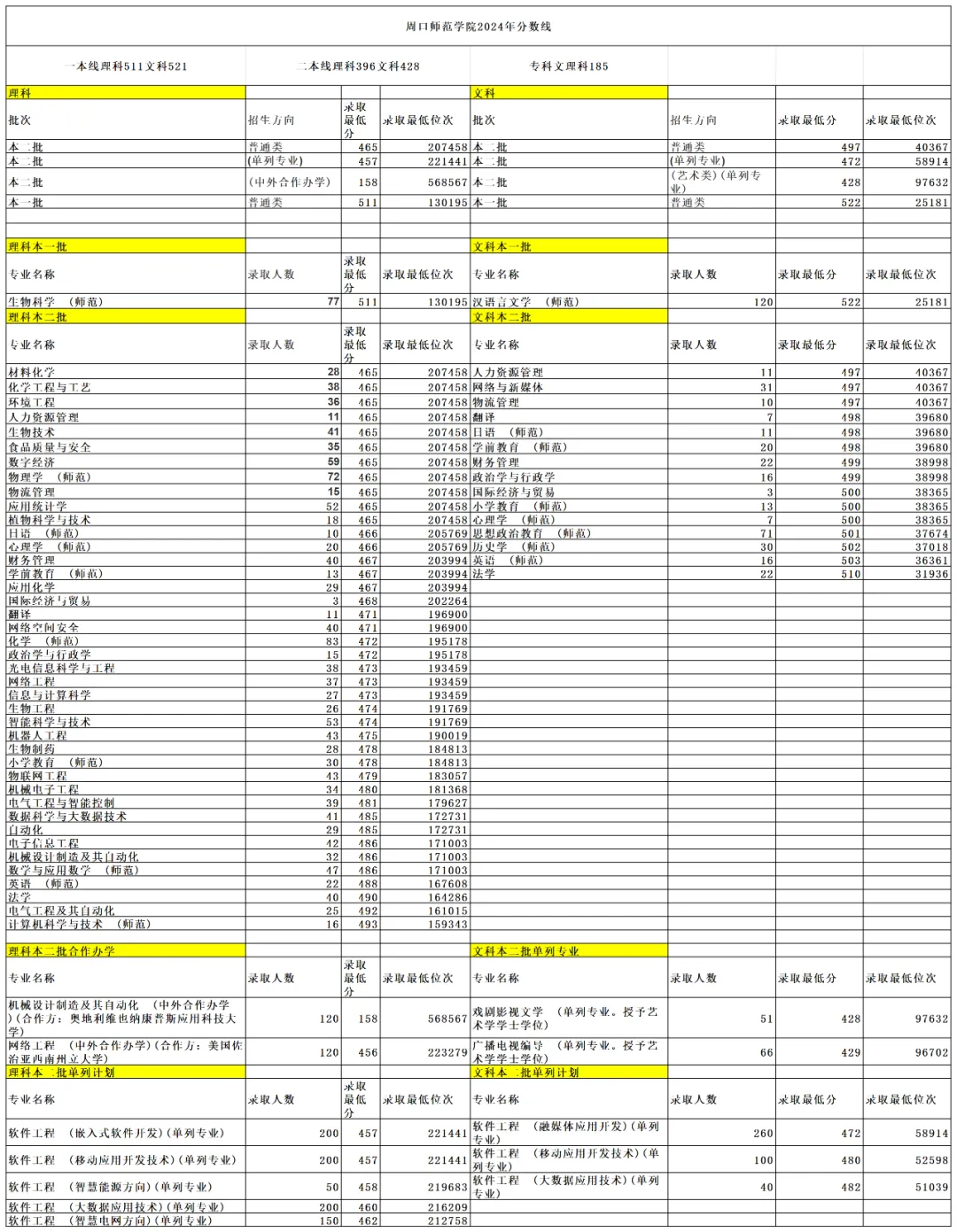 从最近几年分数录取趋势周口师范的最低录取分数逐年下降,每年基本1万位次的降。2024年各专业录取分数: