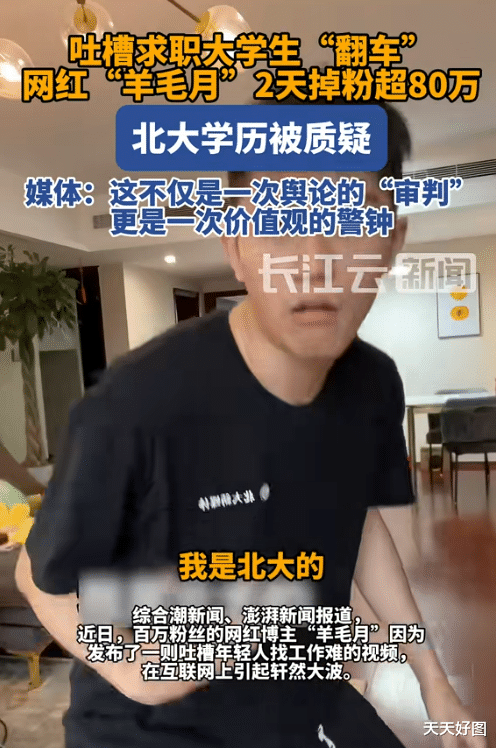 在视频中,羊毛月面对镜头发出疑问,现在大学生都这么难找工作吗?他表示刷抖音 10 条有 8 条都是秋招 “零 offer”,并对大学生找工作难的情况表现出不在意的态度,还称 00 后整顿不了职场却都想来当网红卷他们。