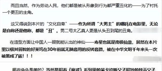 其次,他们批评《哪吒2》过于煽情,还说哪吒是“丑角”,整个电影透露着文化自卑。