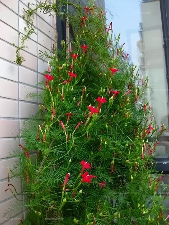 夏天秋天是茑萝的花期,开花特别多,而且,别小看一粒小小的种子,如果不小心掉落到花盆里面或是掉落到院子里面,它自己发芽长大。