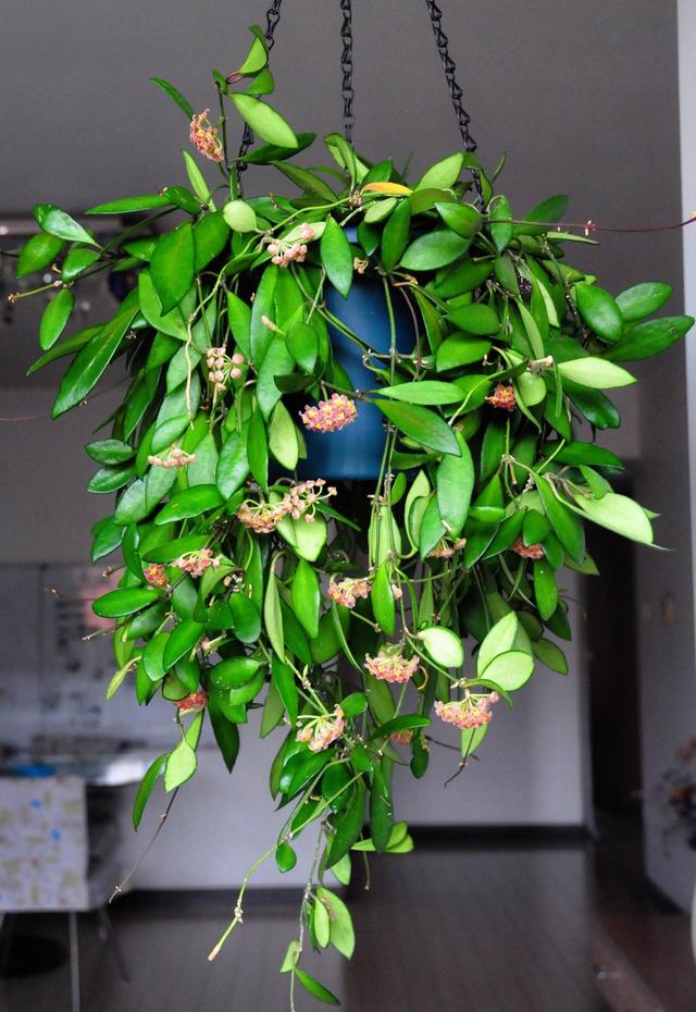 在阳台上的花盆里面养一株球兰,真的颜值会比绿萝吊兰要高多了,它用小一点的花盆也是可以养的,它在光照不那么好的地方也可以顺利长大开花。