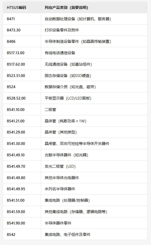 以上税号对应的商品包括集成电路、半导体器件、闪存、智能手机、平板电脑、笔记本电脑、显示模组等。
