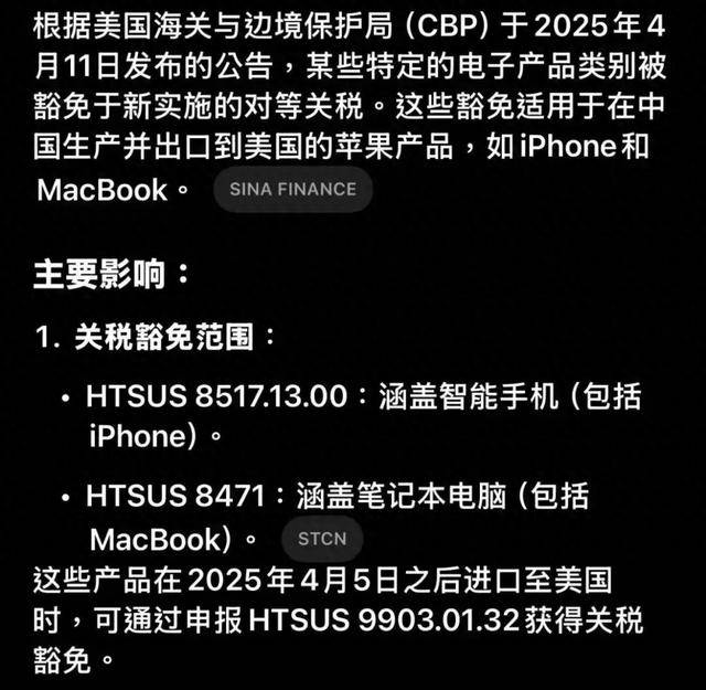 美东时间4月11日晚间,美国海关宣布,根据特朗普总统当日签署的备忘录,对以下税号的商品不征收第14257号行政令(即4月2日发布的“对等关税”行政令,随后于4月8日、9日修订)下的“对等关税”。因此,对原产于中国的这些商品不再征收125%的“对等关税”。