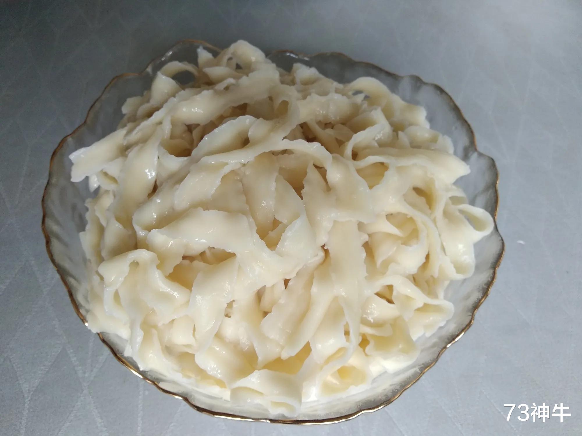 2.宽面条煮熟后捞出过凉。