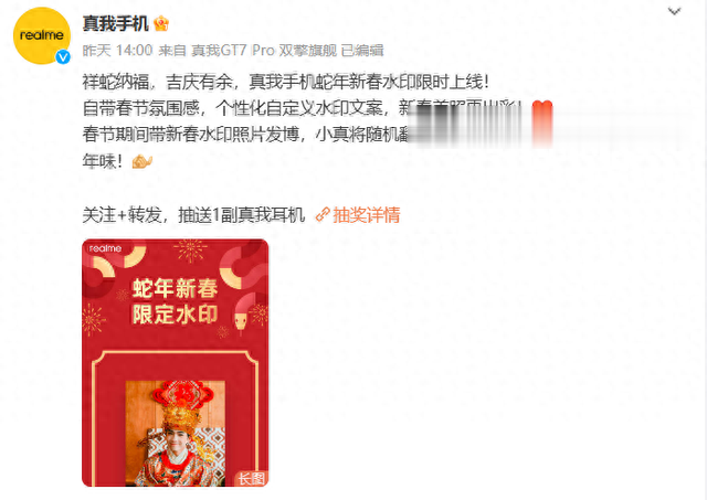 真我手机官方日前宣布:“祥蛇纳福,吉庆有余,真我手机蛇年新春水印限时上线!自带春节氛围感,个性化自定义水印文案,新春美照更出彩!”