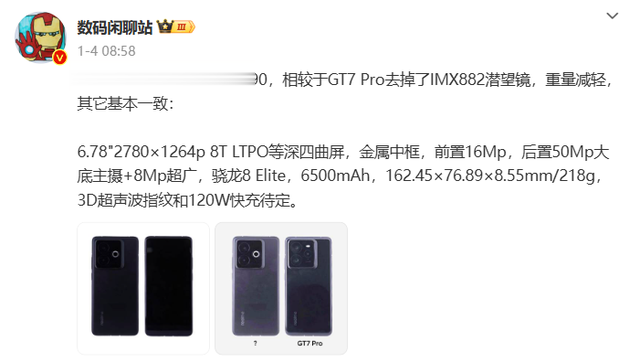 除了真我Neo7 SE外,博主@数码闲聊站 的另一份爆料中提到:“真我一个神秘新机RMX5090,相较于GT7 Pro去掉了IMX882潜望镜,重量减轻,其它基本一致:6.78"2780×1264p 8T LTPO等深四曲屏,金属中框,前置16Mp,后置50Mp大底主摄+8Mp超广,骁龙8 Elite,6500mAh,162.45×76.89×8.55mm/218g,3D超声波指纹和120W快充待定。”