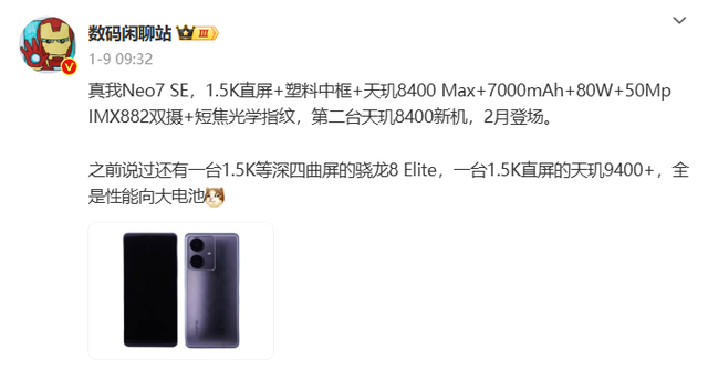 该博主表示,真我Neo7 SE将会搭载一块1.5K直屏,配备塑料中框,内置7000mAh电池,支持80W快充,后置5000万像素的IMX882双摄,采用短焦光学指纹。