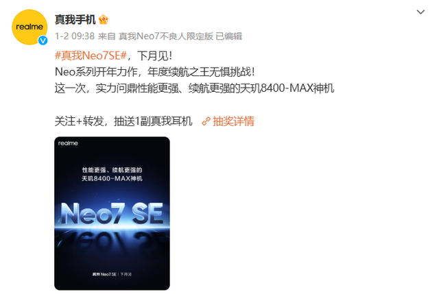 官方介绍显示:“真我Neo7 SE,下月见!Neo系列开年力作,年度续航之王无惧挑战!这一次,实力问鼎性能更强、续航更强的天玑8400-MAX神机”。