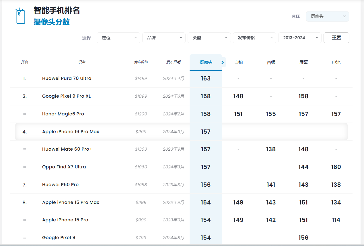 苹果最新款智能手机得分为157分,与华为Mate 60 Pro+和Oppo Find X7 Ultra不相上下。只有少数设备的得分更高:荣耀Magic6 Pro和谷歌Pixel 9 Pro XL都得到了158分,华为Pura70 Ultra以163分排名第一。