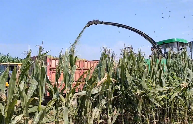 青贮玉米和普通的大田饲料玉米不一样。青贮玉米收获时,茎秆、叶片、玉米穗等,全部一起收获了,有些直接打碎装车,有些则是整株不打碎,然后装车拉走。