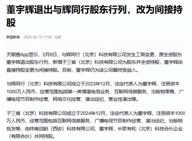信息来源:界面新闻 2025-02-10 董宇辉退出与辉同行股东行列,改为间接持股