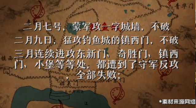 二月七号,蒙军进攻一字城墙;二月九号,猛攻钓鱼城的镇西门;三月,连续进攻东西门、奇胜门、镇西门、小堡等处,均遭到守军顽强反攻,全部失败;四月,偷袭城南的护国门也未能得逞。