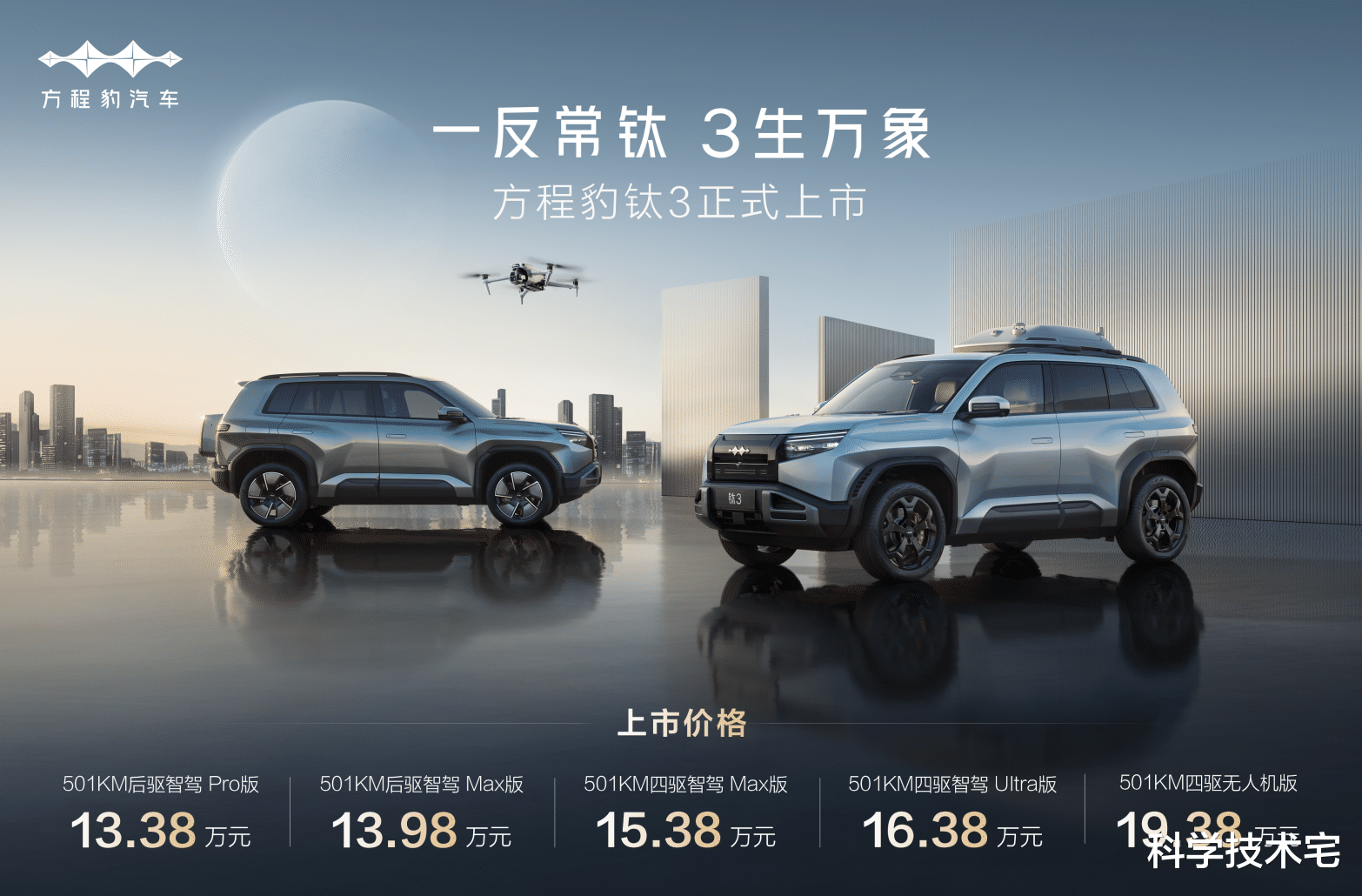 4月16日,比亚迪个性化品牌——方程豹科技潮品SUV钛3正式上市,这款车型共计5个版本,惊喜价格13.38万起,并提供至高5500元的金融贴息政策,以及5大超值购车权益。
