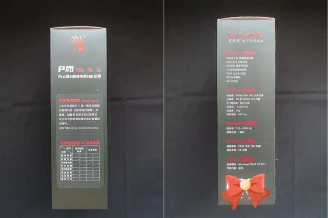 首先来看这款鼠标的外包装,颜色上主要采用黑色和红色,这个颜色搭配算是延续了血手幽灵的一贯风格,包装的正面就可以看到鼠标的产品渲染图,双飞燕的产品LOGO、产品型号以及产品的几个主要卖点。
