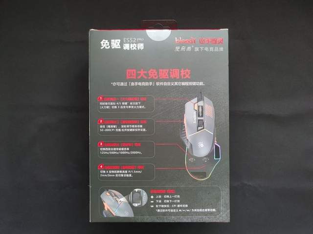 外包装的背面和侧面介绍了鼠标的相关配置,包括特色功能等。在背面着重介绍了鼠标的四大免驱调校功能。