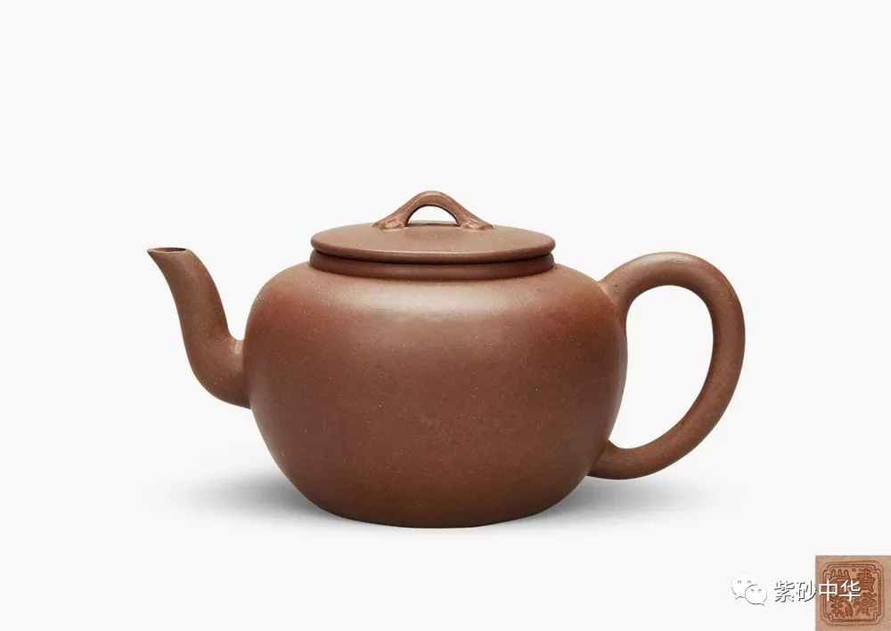此壶紫泥为胎,泥色褐红。圆肩,鼓腹饱满,口沿起双圈线,平盖上置如意型壶钮,整器通体光素,器物表面点点颗粒显现,光素简约,古朴拙雅。