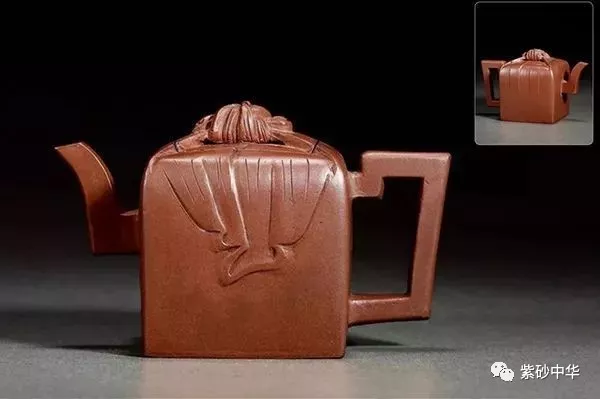 此壶形以紫泥制成,呈栗红色,古穆朴雅。壶体成正方形,壶盖至壶身上部以线条勾勒出包袱褶皱,截嵌盖与壶身布满的包袱褶皱合为一体,左右两边对置亦可吻合。钮作布结状,弯折嘴,方执把,舒展而有力。