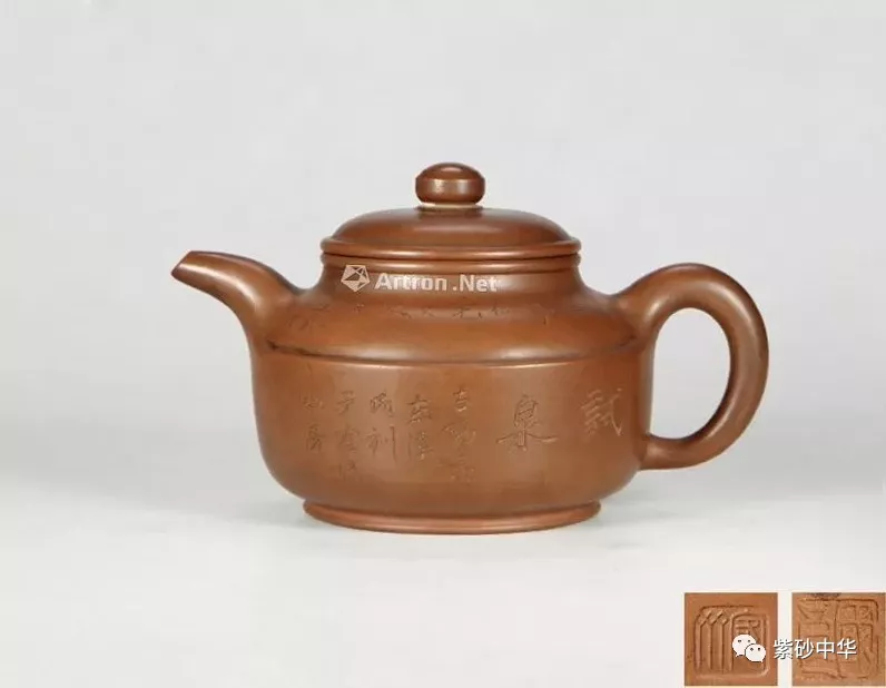 壶身由光绪陶刻高手东溪刻“试泉”二字,并作铭。壶肩部镌刻定制人及受赠人名款,反 面刻绘清供图。壶盖内钤印“国良”二字,壶底钤印“愙斋”方章。