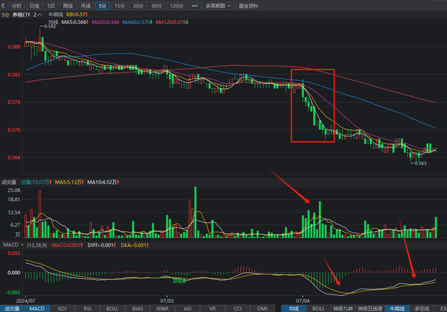 下图为养殖ETF5分钟级别的K线图,从图中红色矩形处的那波急速下跌可以看到,成交量是明显放量的,然后转为震荡趋势,在这一段震荡趋势中我选择买入一份养殖ETF。