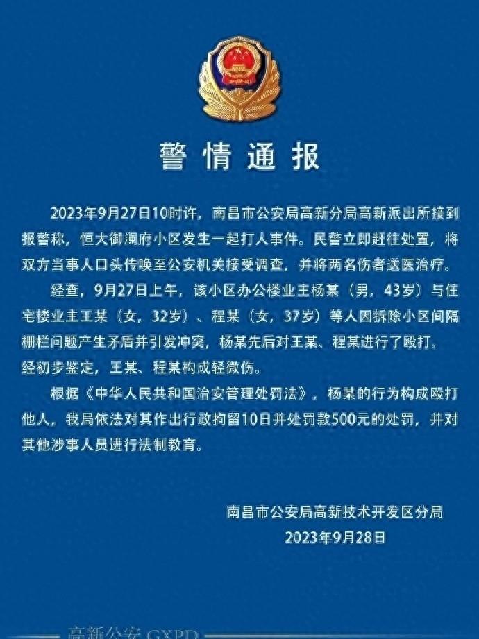 9月28日,南昌市高新技术开发区分局发布警情通报,经鉴定,被打的女子王某和程某构成轻微伤,打人者杨某被处以拘留10日,罚款500元的处罚,对其他人员进行了法制教育!