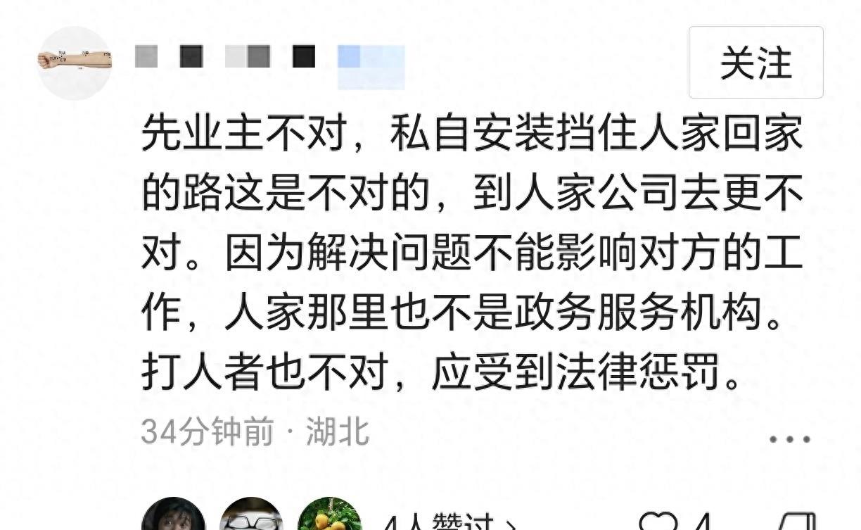 先业主不对,私自安装挡住人家回家的路这是不对的,到人家公司去更不对。因为解决问题不能影响对方的工作,人家那里也不是政务服务机构。打人者也不对,应受到法律惩罚。