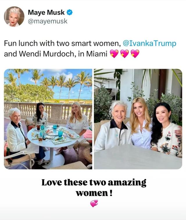 三个女人在迈阿密一起吃饭,这场聚会不仅仅是朋友间的简单见面,更像是展示各自人脉和地位的场合,也让人联想到马斯克家族与政界商界的紧密关系。