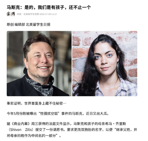 信息来源:澎湃新闻 2022-07-08 马斯克:是的,我们是有孩子,还不止一个