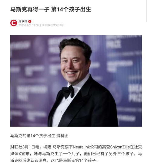 信息来源:财联社 2025-03-01 马斯克再得一子 第14个孩子出生
