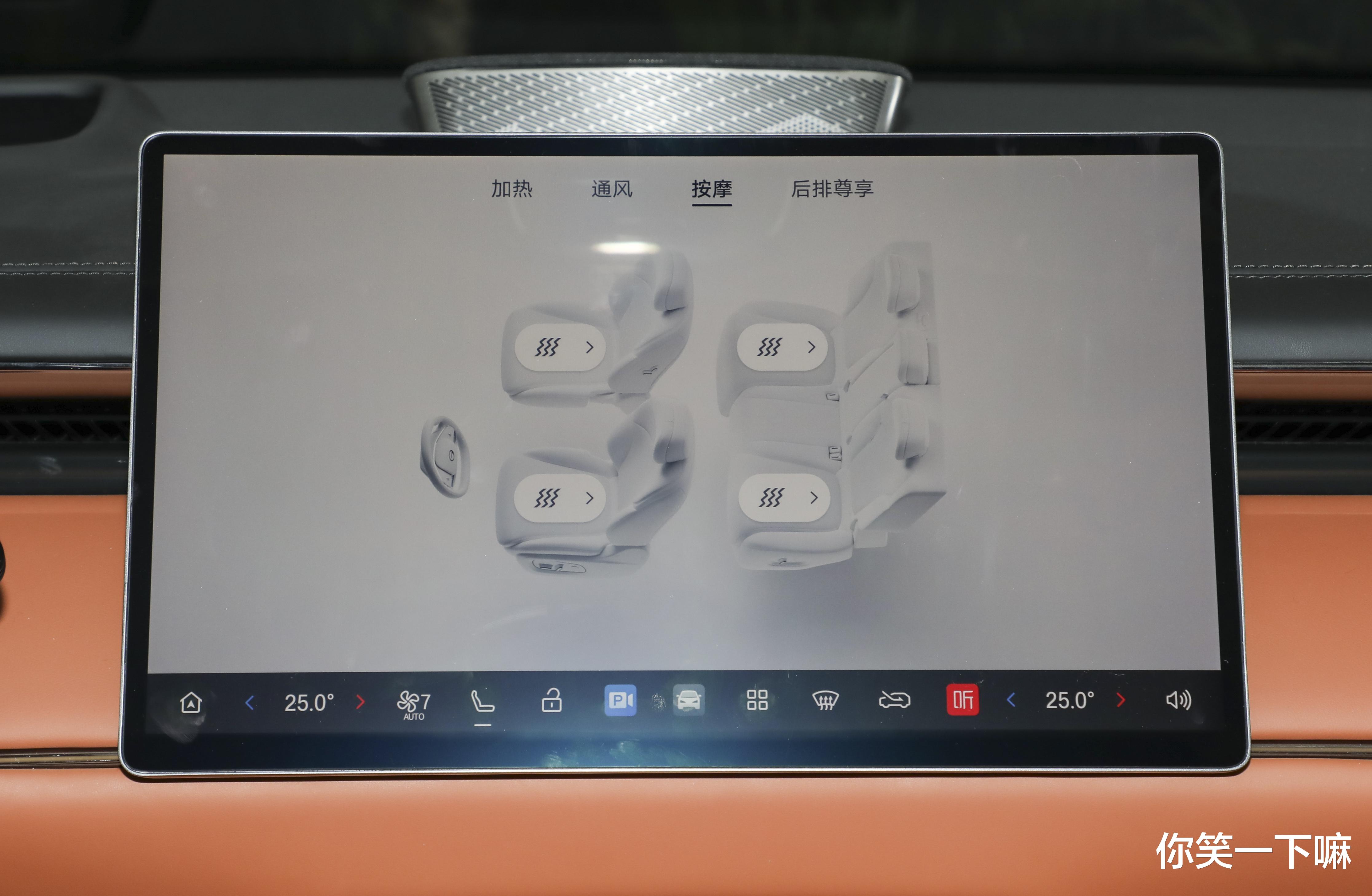 值得一提的是,这款车的座椅功能堪称“头等舱级”。前排座椅支持通风、加热和按摩功能,提供6种模式和3档力度调节;后排座椅则配备电动腿托,可以调节至137°,开启“按摩躺椅”模式,让旅途更加惬意。