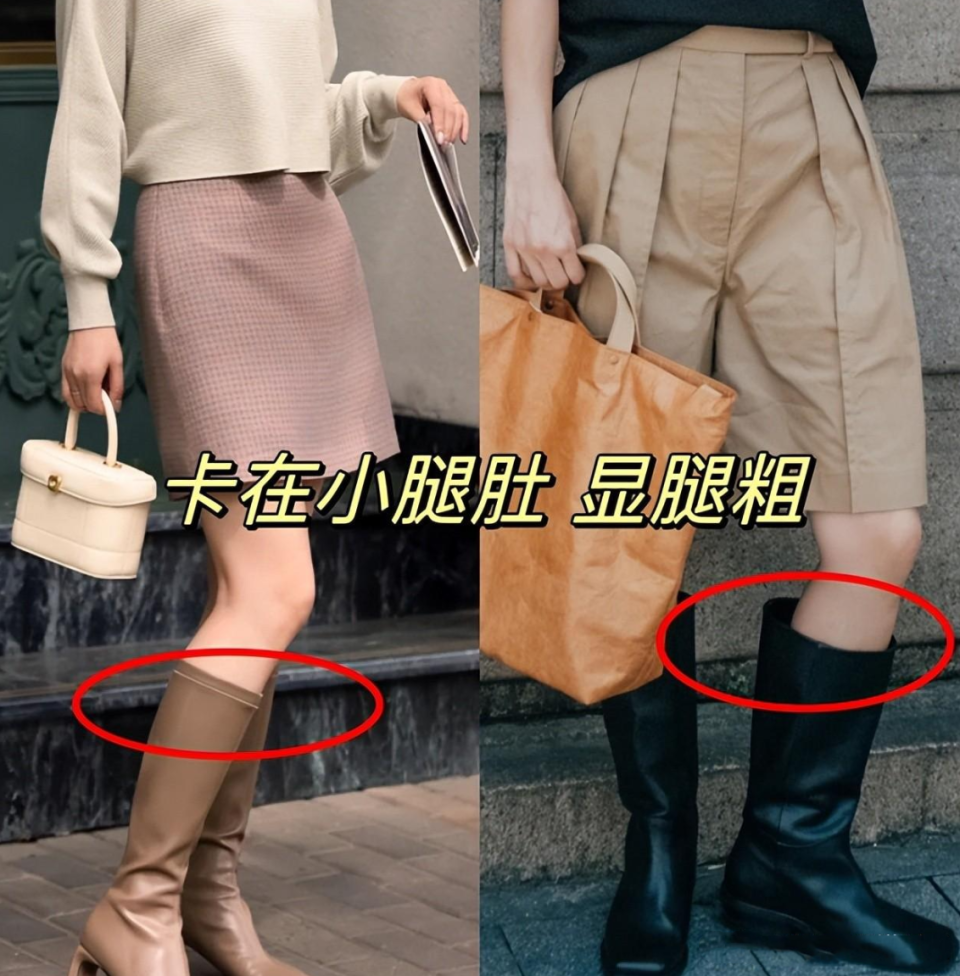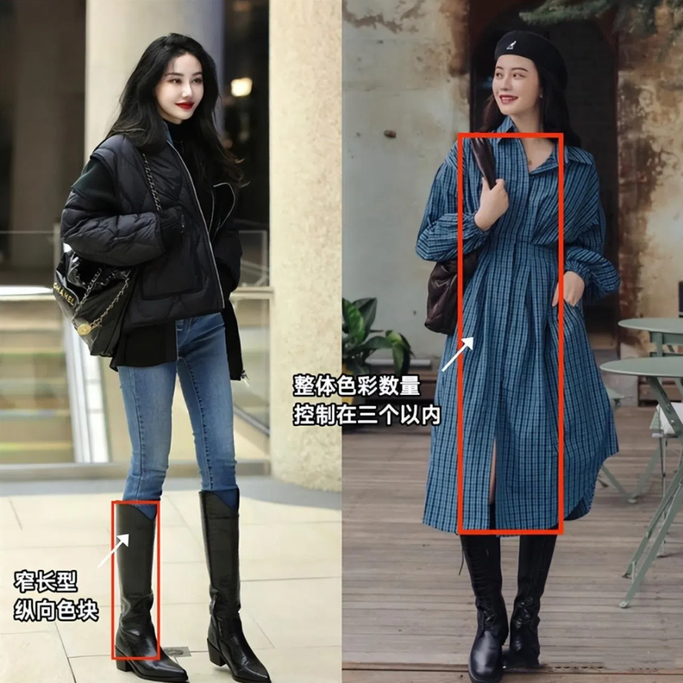 像这种过膝长度的长筒靴就是那些身高在160以下的小个子首先要避免的,这种长度卡在大腿中间,小个子如果穿,甚至可能直接把双腿给掩盖住,不管是时尚感还是增高效果都很差。