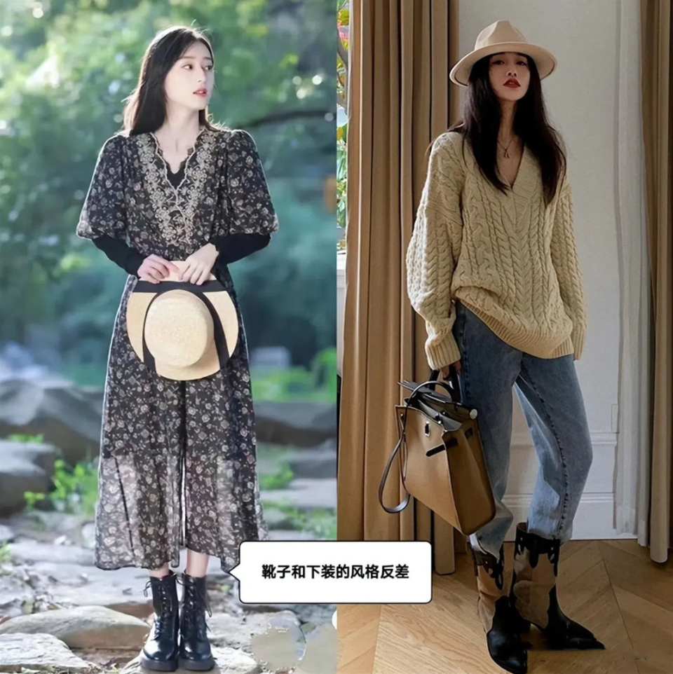 靴子的材质,大多选用皮革材质,这不仅导致靴子风格单一,只能演绎酷帅风,还导致“裙子+靴子”造型千篇一律,根本无法满足我们多种多样的穿衣需求。