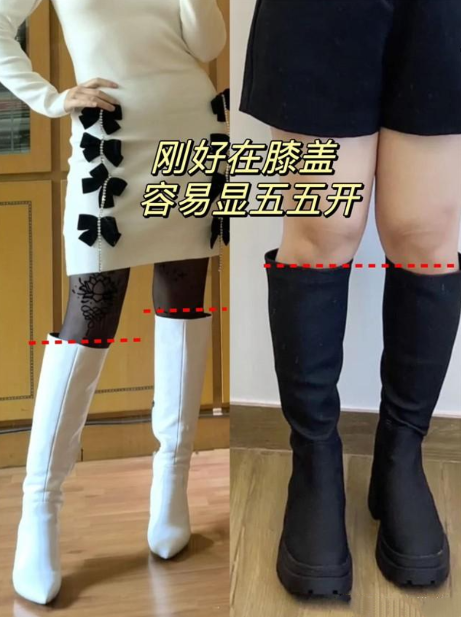 第二种:卡在膝盖处的长筒靴,会显五五开