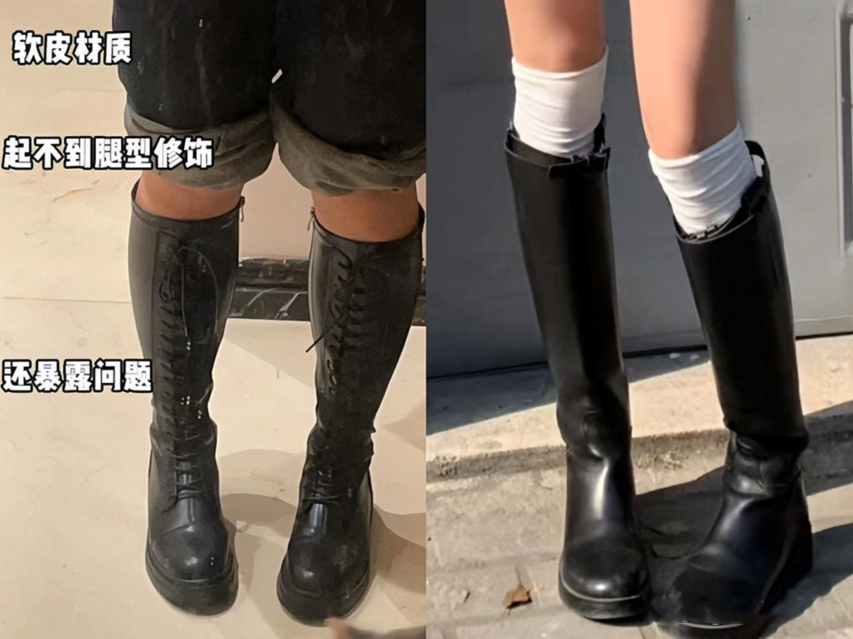 挑选靴子第一点要注意的就是材质的选择,软皮和硬皮材质,我更推荐硬皮,因为软皮材质的靴子虽然穿在身上比较柔软舒适,但是容易变形,对于腿型的修饰效果差,像本身腿型不好看的女生,穿久了这种软皮的靴子就因此容易导致靴子变形,也会放大个人的腿型问题。