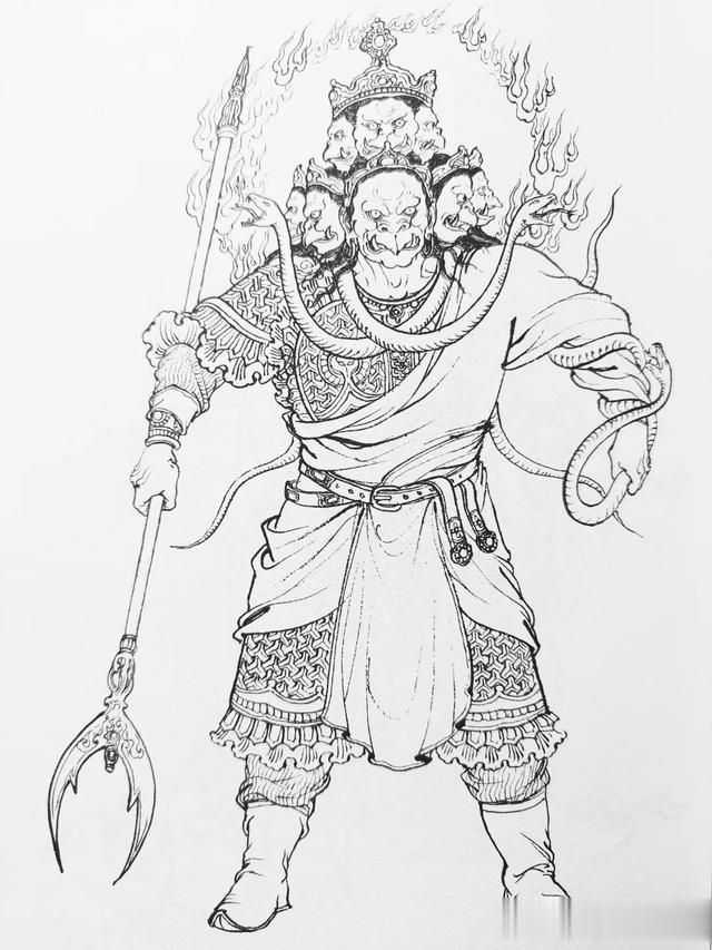 猪八戒伫立山头观望,伺机上前筑一钉耙又赶紧退回。那驸马有九颗头颅,四面八方都看得明白,每逢猪八戒近前即拿铲鐏架着钉耙,铲头抵着金箍棒。如此又缠斗六七个回合,驸马逐渐不敌,虚幌一铲就地一滚,又纵身跳起化作一个九头虫。