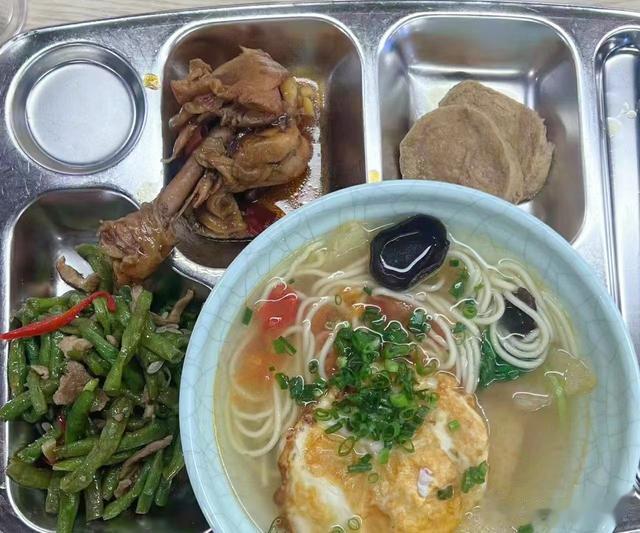 除此之外还有陈晓梅爱吃的豆角炒肉,豆角炒的很入味,另外食堂阿姨卤的鸡腿吃起来鲜嫩多汁,卤香味十足。