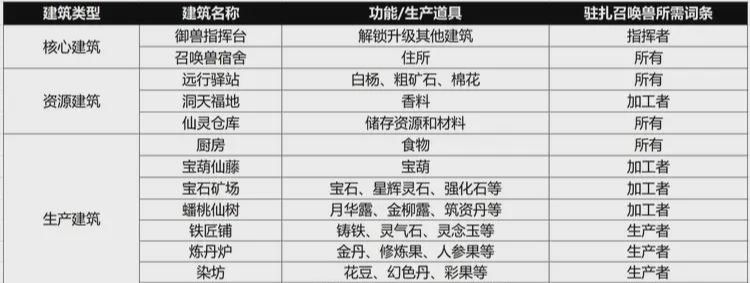 目前御兽建筑分为三类,分别为核心建筑、资源建筑、生产建筑。每种建筑的功能与驻扎所需要的召唤兽词条不同,皮皮剑来一一为大家介绍一下。
