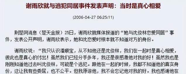 谢雨欣就与逃犯同居事件发表声明:当时是真心相爱=2006-04-27 06:25:11荆楚网消息