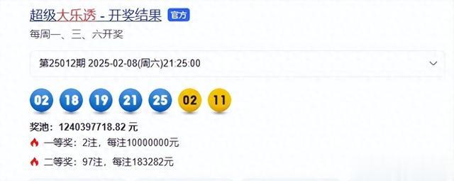 大乐透第25012期奖号为:02 18 19 21 25+02 11