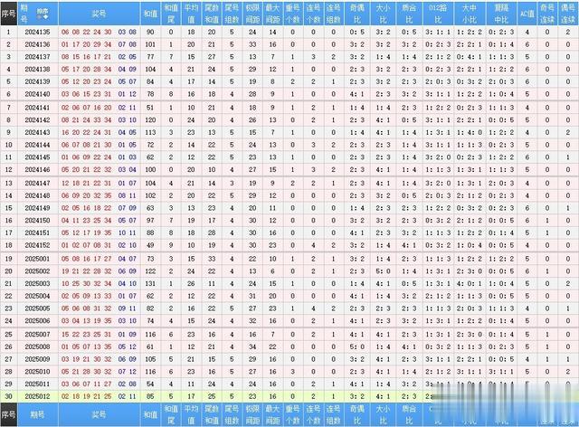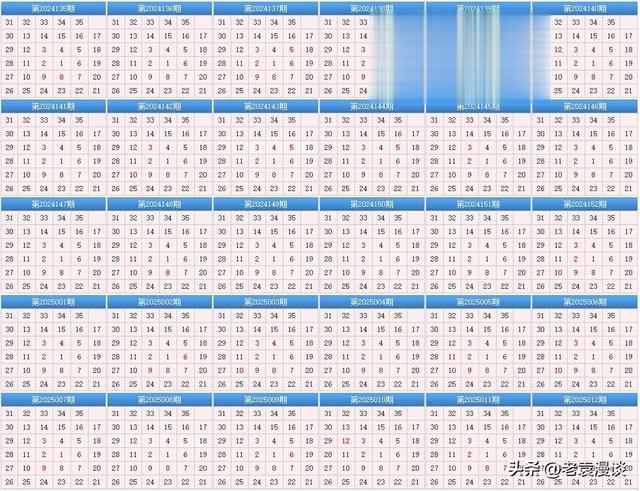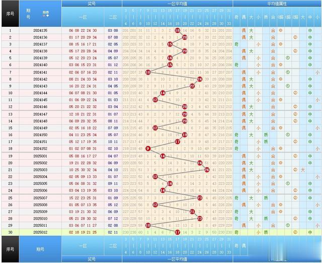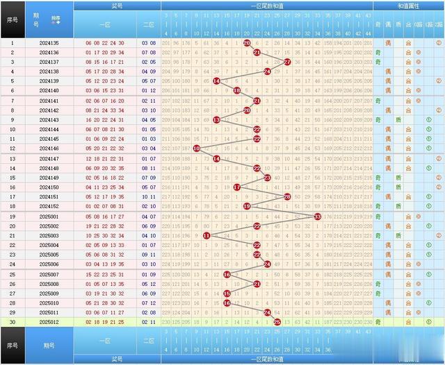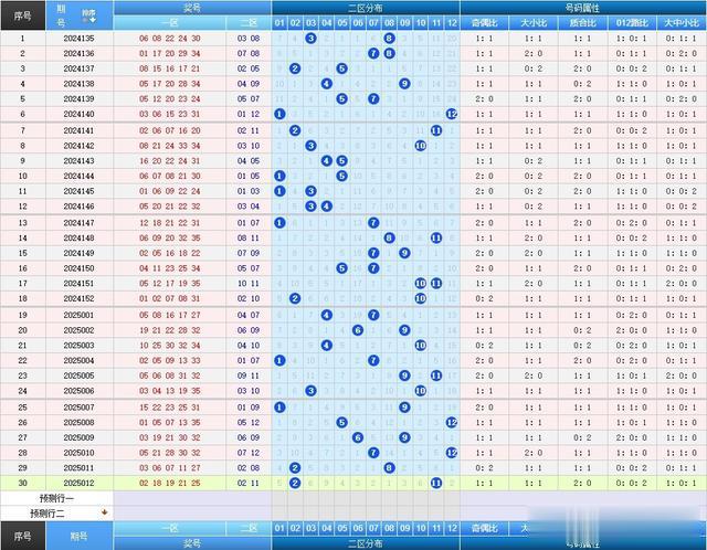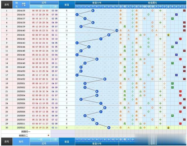 前区冷码分析:截至第2025012期后,前区共有8个遗漏值9以上的冷码。这些冷码的遗漏期数分别为:号码16遗漏11期、号码17遗漏未提及但属冷码范畴、号码12遗漏13期、号码20遗漏16期、号码24遗漏19期、